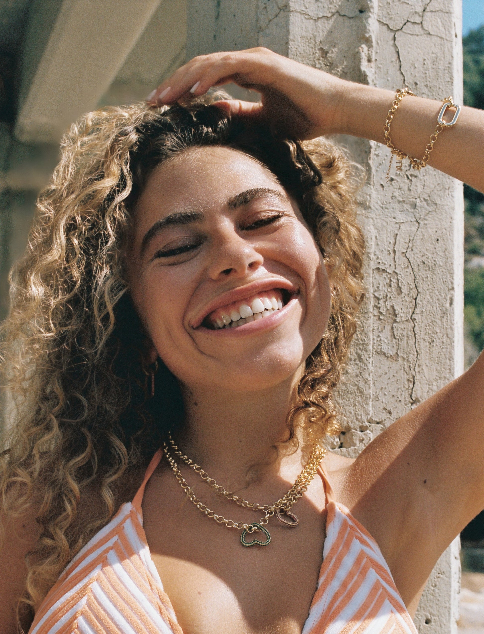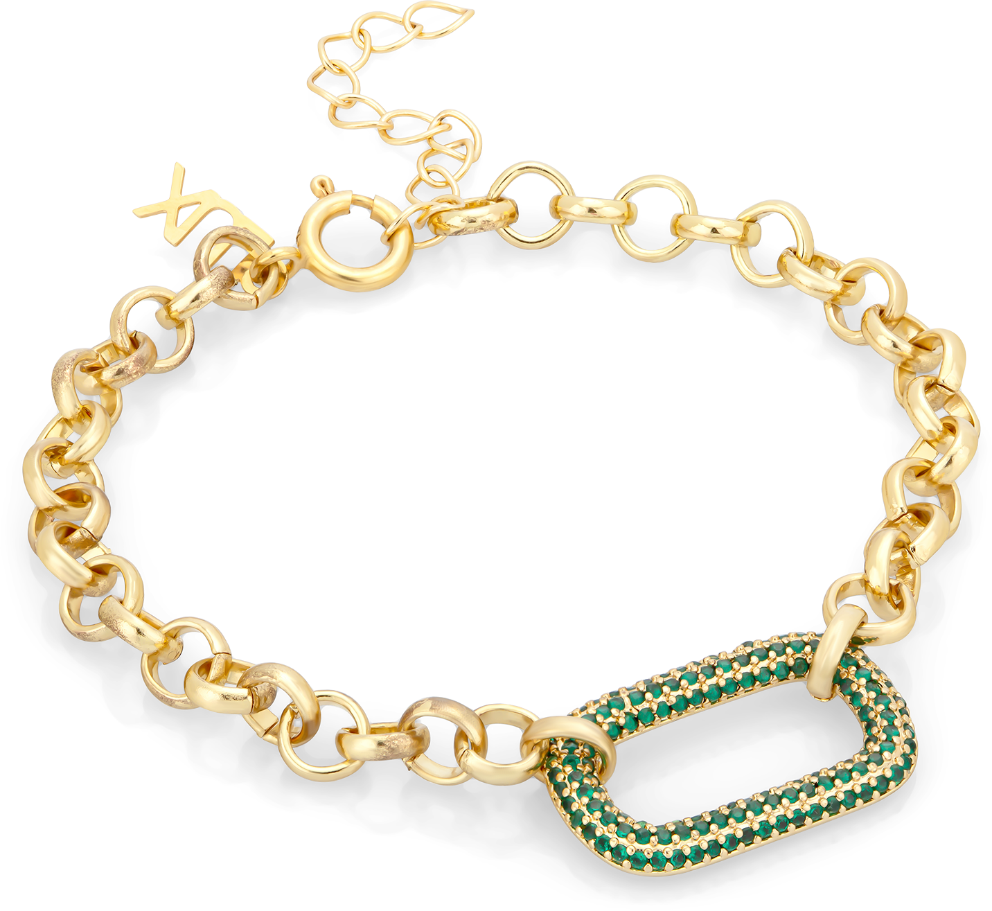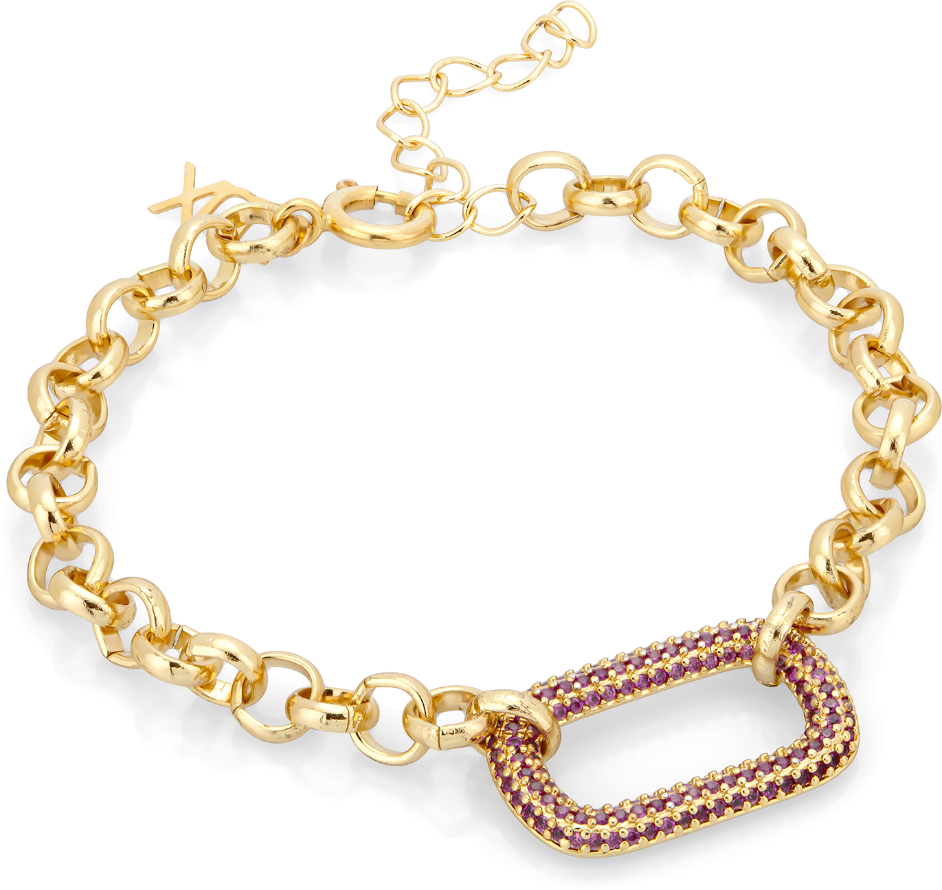 צמיד חוליות בשילוב אבזם משובץ זרקונים ורודים/ירוקים במרכזו.